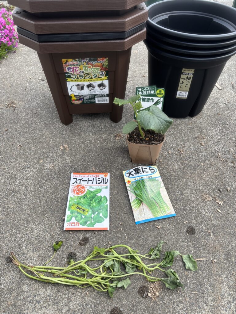 植木鉢、バジル、ニラの種、キュウリの苗、さつまいもの蔓を買ってきました。